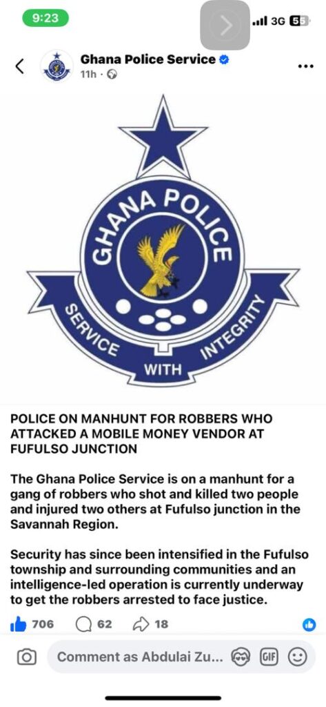 “The Ghana Police Service is on a manhunt for a gang of robbers who shot and killed two people and injured two others at Fufulso Junction in the Savannah Region,” the statement indicated.