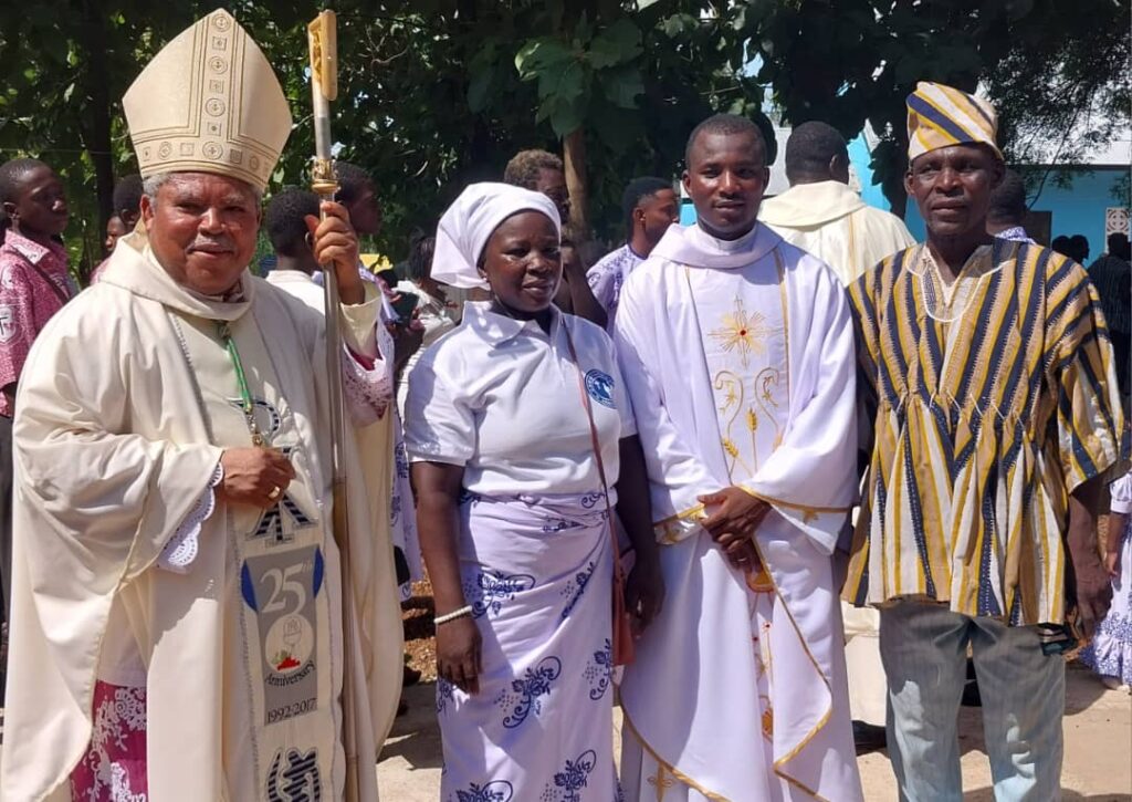 On Saturday, 4th October, 2025, the St. Peter’s Parish in Lingbinsi witnessed a momentous celebration as the Catholic faithful gathered in joy and thanksgiving to honor Rev. Fr. Gilbert Wusah Tika, the first-ever Tampulma priest, at a special Mass presided over by Rev Fr. Gilbert Wusah Tika and concelebrated by Most Rev Peter Paul Yelezuome Angkyier, Bishop of the Damongo Diocese, together with a score of priests within the Diocese and the province.